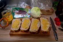 Making a sandwich shouldn't require much instruction. Cut the bread in generous slices, spread som mustard on each slice, add whatever you like - lettuce, ham, bacon, sausage, cheese, tomatoes, cucumber, avocado, onion, pickle, jalapenos. Not it all, but a suitable and balanced selection. Remember that the bread and the vegetables is the meal. The meat is the treat!