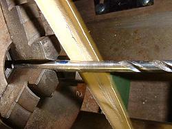 Feathering the tabs refers to the practice of thinning the very ends of the serrated tabs to the thickness of a sheet of paper or less. Here's how it is done. Begin by inserting a 13/64 drill bit backwards into the jaws of your lathe or electric drill. Wrapping masking tape over the flutes of the drill helps the chuck tighten securely. Slide the male ferrule over the ono-fluted end of the drill bit. Friction will keep it snug.