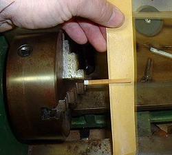 Cutting a marked ferrule station in the lathe with a jeweler's saw.