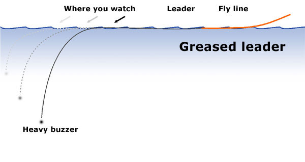 The last method is rather special utilizing a greased leader. Grease up a very long, level leader - about 25 feet or 6 metres. Tie on a heavy buzzer and cast it out as best you can. Keep your eyes glued to the small dimple that forms where the leader is drawn through the surface as the fly sinks. Strike the instant you see it dip.
