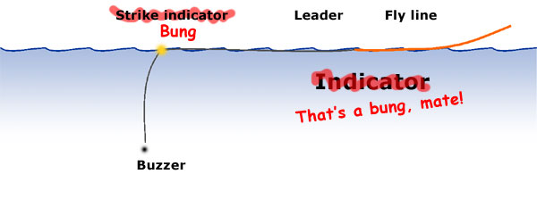 In Wales it's called a bung, but a strike indicator is probably easier to understand for the rest of us. Fish the buzzer like you would any nymph under an indicator or a large dry fly. The method is very good in calm conditions. Experiment with depths until you start getting strikes.