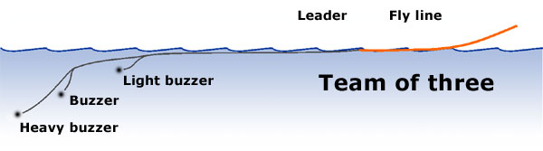 - a top fly or top dropper - a light buzzer, typically a fluffy one or one tied on a light hook