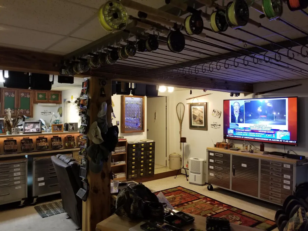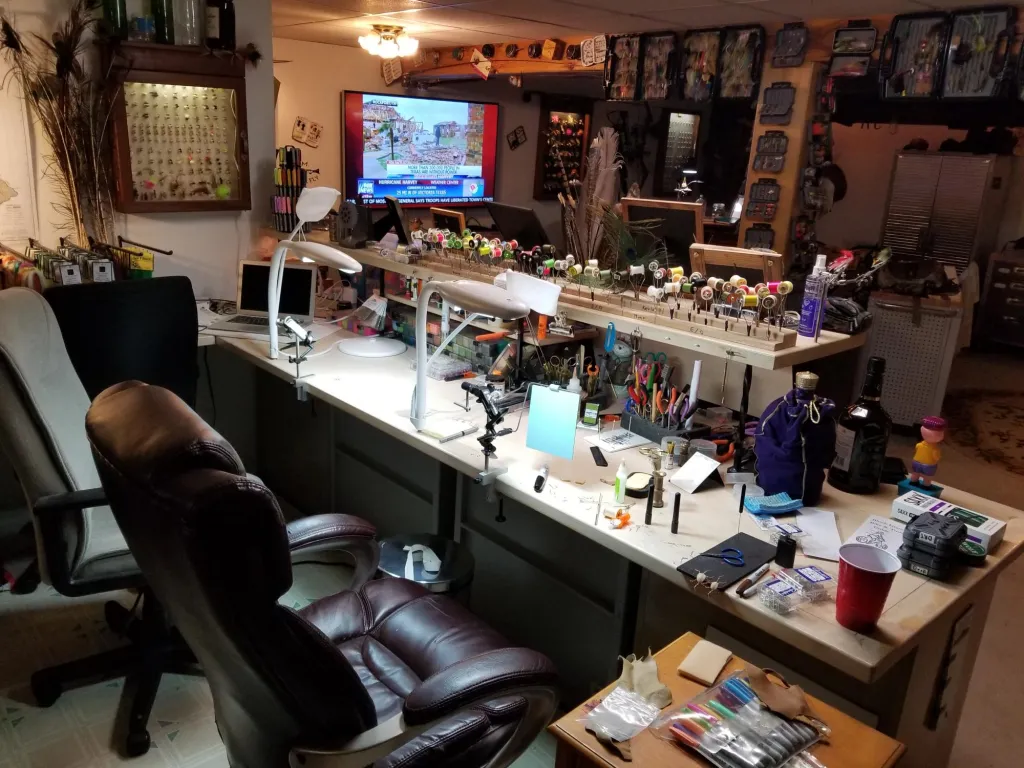 That's quite a setup you have there. I have a few questions for you, first, if you have ever been married, are you still married? Not many women would be so gracious to grant her husband the space, let alone the resources to invest so much into their sport/hobby. Also, I'm assuming this is primarily your tying space and not a museum? That is quite a collection of fly tying tools, materials, and fishing equipment that you have. I would pay money just to see it in person. And my final question is what is your favorite vise, bobbin, whip finishing tool, etc?