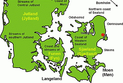 I live where the red spot is. That's København (Copenhagen), the capitol of Denmark. I have fair access to salt water fishing but very poor access to stream fishing. Most good streams are in Jylland (Jutland) and on the island Fyn (Funen).