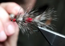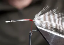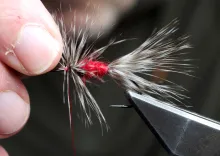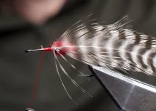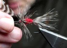 All the hackles can be made from one large grizzly feather. A large, saltwater style saddle can deliver the proper feather, but one might also be found on the sides and top of many of the coarser dry fly saddles. You need one or a couple of feathers with fairly long barbs, the longest ones being 1½ even 2 times the hook gape. As you work your way forwards on the hook, using parts of the feather closer to the tip, you get a natural taper to the fly, the final frontal hackle being quite small. The red dubbing and the red head offer some contrast, and if you use genuine seal’s fur, you even get the almost magic translucency and shine that’s found in this material. Light is caught and reflected in the material in a quite special way.
