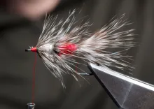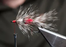 with several sections divided by hackles like many flies such as the already mentioned Omoe Brush, the Djihad, Brenda, the Swedish salmon fly Ullsock and many more, quite a few of these owing a lot to the Irish shrimp and grub flies for salmon. In the case of the Raccoon there’s a round of hackle forming the tail, a red dubbing section with the eyes, another hackle, a lighter dubbing section, a hackle and a final small light section and a small front hackle.