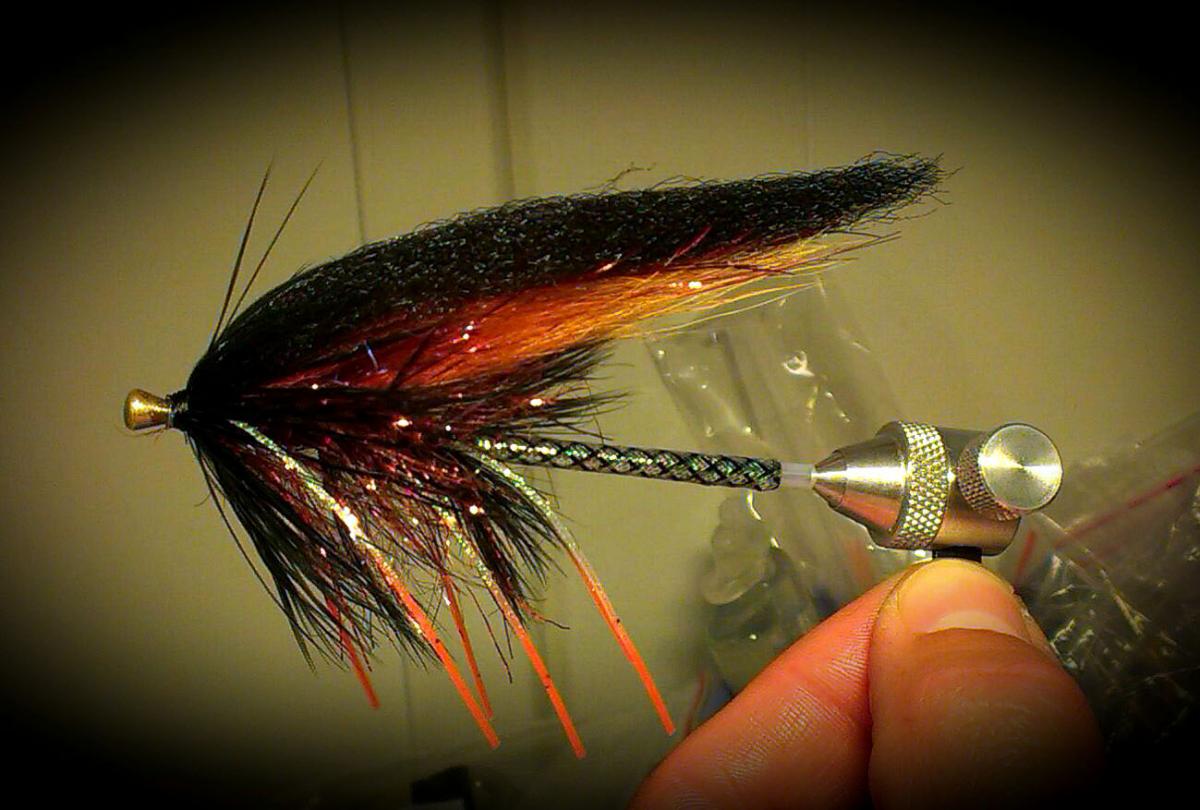 Danish Allan Nørskov Johansen ties a large, gaudy and semi-crazy fly with lots of hair, flash and rubber legs for stream fishing at night for sea run brown trout.