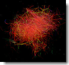 3. Rabbit and SLF - Cut natural rabbit off the skin and remove as many guard hairs as possible. The remaining underfur is normally a dull gray. Mix into this SLF in one or several colors. The SLF must be cut into pieces no longer than 1/2" (1.5 cm). I like a combination of bright red, dark olive and off white. I take 1/3 of each adding up to approx 1/4 of the whole portion.